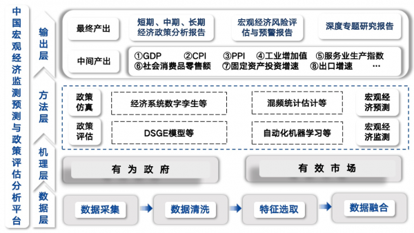 平台坚持以服务国家宏观经济治理为核心使命,深入剖析“有为政府”“有效市场”“统筹发展和安全”等理念内涵,构建覆盖监测预测、政策评估、政策仿真与决策支持的全链条分析体系。“有为政府”和“有效市场”相互依托、辩证统一。平台注重利用经济统计测度前沿理论,抽取“有为政府”和“有效市场”的关键特征;注重宏微观结合,构建混频监测预测系统,助力经济动态的及时感知;重视非结构化文本数据的挖掘,通过文本动态主题模型、知识图谱等工具,促进政府与市场主体开展信息的高效反馈;平台化部署DSGE工具,便利政策仿真的开展。聚焦服务宏观经济治理是本平台的核心战略定位,是深入开展平台后续建设的根本性要求。