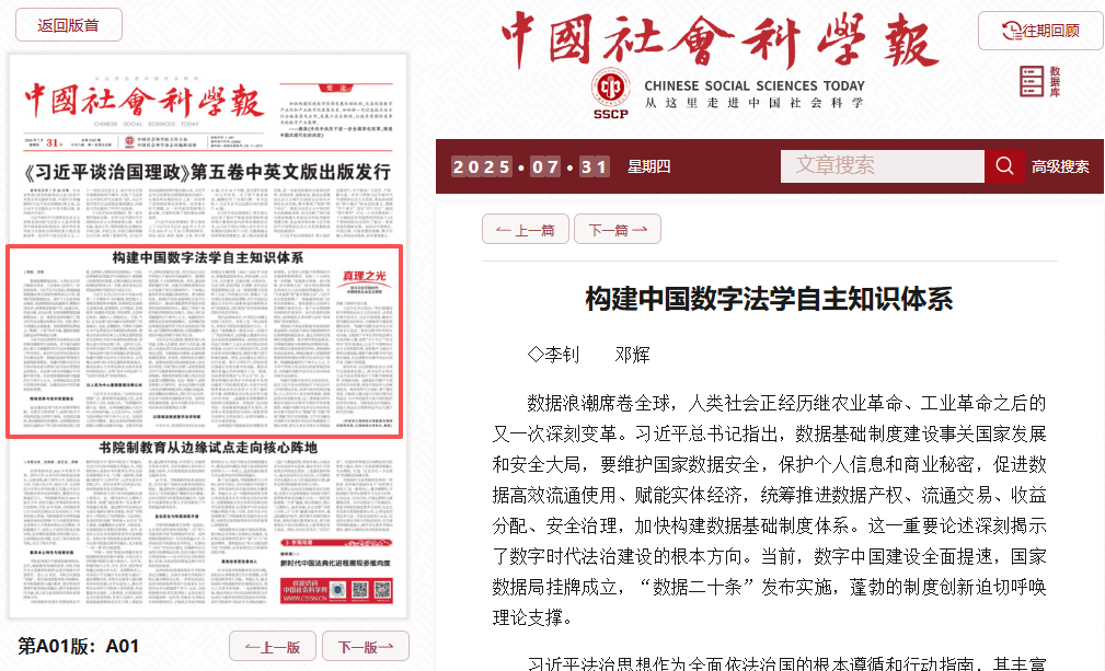 《中国社会科学报》“真理之光”栏目是展示我国哲学社会科学最新理论成果的重要平台。此次文章在该栏目头版刊发,充分体现了我校在数字法学研究领域的学术影响力,标志着我校法学学科建设取得新的重要突破。