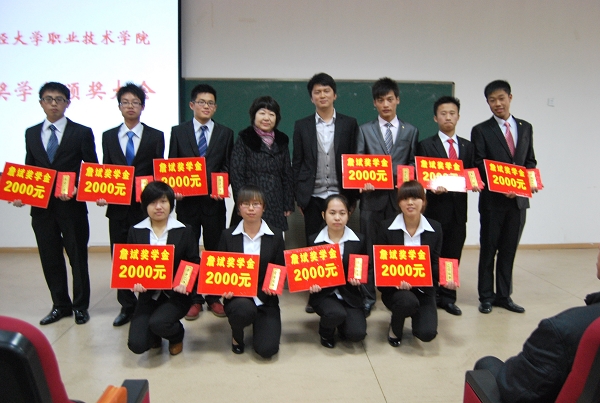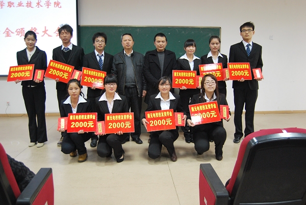 2011-2012学年职业技术学院企业奖学金颁奖典礼于12月4日14:00在麦庐园D108教室隆重举行。职业技术学院校友会常务副会长、江西洪城旅运有限公司总经理徐红兵先生,江苏昆山维安信电子有限公司董事长助理施铭先生,学院负责同志及2010、2011级工科专业学生参加颁奖典礼。