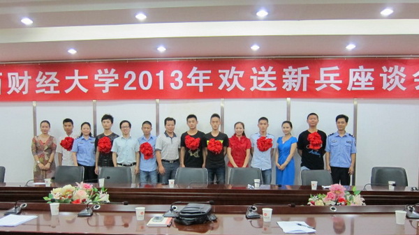 欢送仪式以座谈会的形式进行了相互交流,同学们纷纷表达了对部队的向往和憧憬,同时也流露了对母校依依不舍的眷恋情怀。学生孙可荻作为新兵代表宣下了誓言,他坚定而动情地说道“我愿把生命献给祖国,为祖国的国防建设投入毕生的力量”。座谈会上,校方代表纷纷表达了对同学们的祝福,希望江财学子在部队生根发芽,茁壮成长。