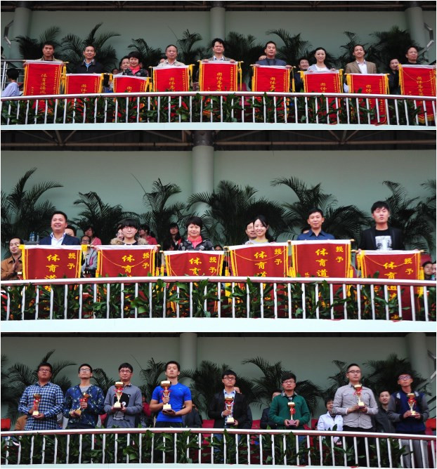 副校长邓辉主持了闭幕式,宣传部部长王金海宣读了体育道德风尚奖的获得者,体育学院副院长曹清宣读了比赛成绩。校领导分别为获奖单位颁奖。