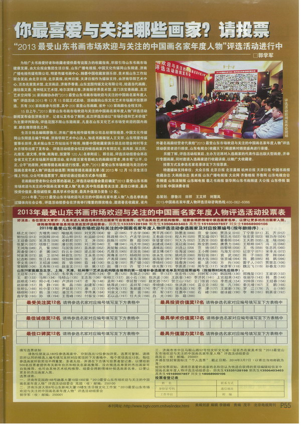 2014年第二期,我校阳小毛教授名列其中,为给广大书画爱好者和收藏者提供最有说服力的收藏指南,积极引导书画市场健康发展,由大众报业集团、生活日报、山东广播电视报、中国文化传媒网等联合发起,北京日报,北京晨报,杭州日报,天津日报作为媒体支持,活动选票截止日期为2014年3月7日,评选活动结束后,由山东电视台收藏天下频道将对颁奖盛典进行录播,在济南举行隆重的颁奖晚会,在公众投票的基础上,评选活动组委会将于2014年3月底揭晓“2013最受市场欢迎与关注的中国画家年度人物”。