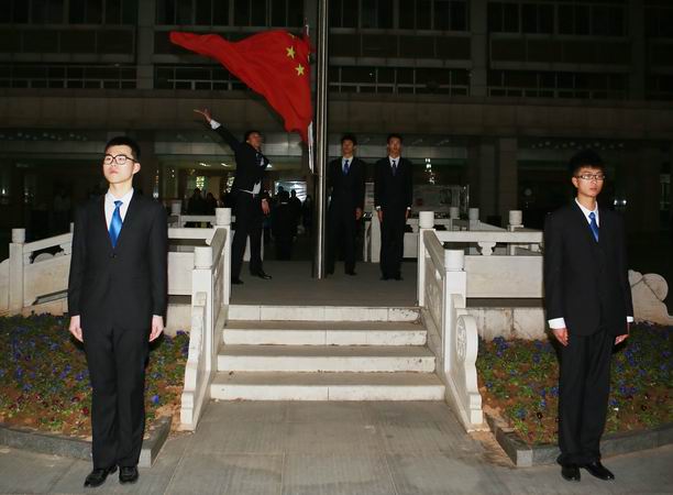 为迎接新年到来,加强爱国主义教育,由校党委宣传部主办、国际学院承办的2013年零点升旗仪式在崛起广场举行,来自学校宣传部、学工处、国际学院和法学院等师生约千余人参加这一活动。