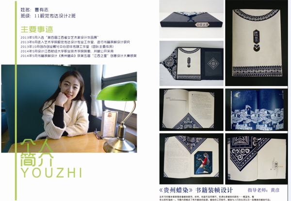 近日,第五届“江西之星”创意设计大赛结果揭晓,我校艺术学院视觉传达工作室学生的设计作品在大赛中荣获银奖、铜奖各两项,其中曹有志同学的《贵州蜡染》书籍装帧设计、王霞同学的《笔墨纸砚》书籍装帧设计获得了银奖,刘倩�同学的《百草堂》书籍装帧设计、朱莹同学的《荣成湾》海带干系列包装设计获得了铜奖。