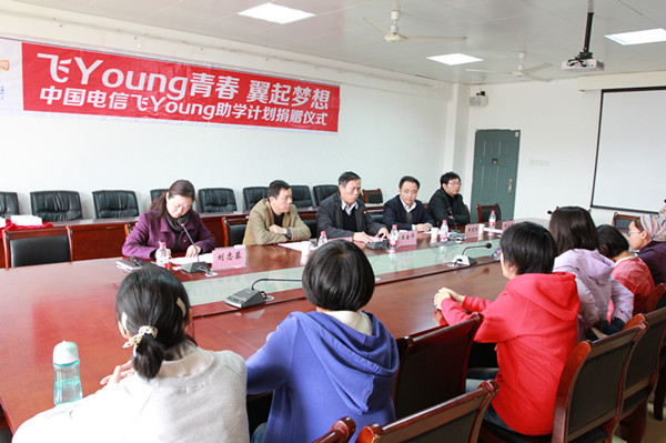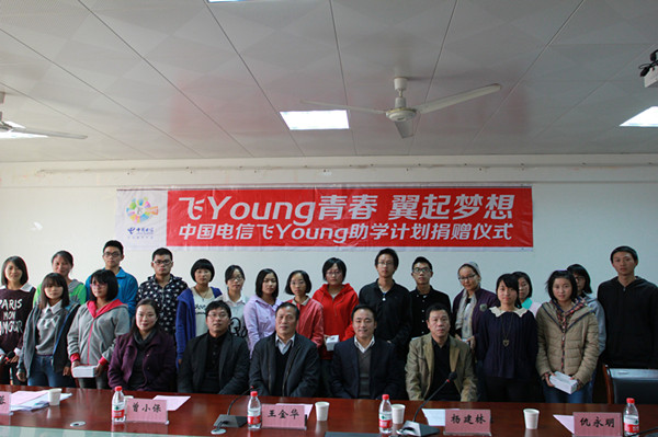 11月12日下午3时,由教育部、中国教育发展基金会、中国电信共同发起的“飞Young青春,翼起梦想”助学计划启动仪式在我校举行。江西电信分公司校园事业部总经理杨建林、南昌电信分公司校园事业部总监曾小保、南昌电信分公司红谷滩分局局长仇永明以及我校党委副书记王金华及学工处相关工作负责人出席了本次活动。