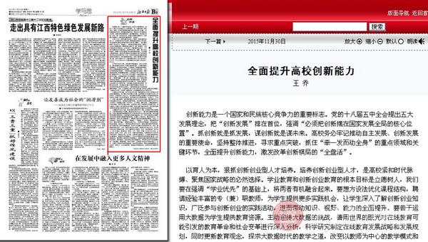 11月30日,《江西日报》理论版刊发了我校校长王乔的署名文章《全面提升高校创新能力》。文章指出,“创新发展”在党的十八届五中全会提出的五大发展理念中排在首位。新形势下,高校务必牢记推动自主发展、创新发展的重要使命,坚持整体推进,寻求重点突破,抓住“牵一发而动全身”的重点领域和关键环节,全面提升创新能力,激发改革创新棋局的“全盘活”。