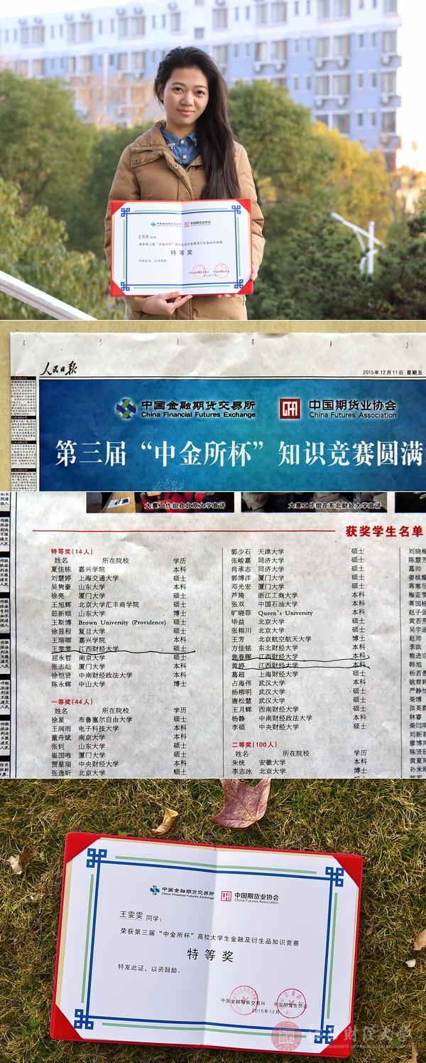 日前,历时近四个月的第三届“中金所杯”高校大学生金融及衍生品知识竞赛落下帷幕。我校金融学院参赛学子与北京大学、中国人民大学、复旦大学、厦门大学、中央财经大学等诸多名校学子一起同台竞技,在所有参赛学生中脱颖而出,共获得特等奖1名、一等奖2名、三等奖6名。其中金融学院金融学专业2014级硕士研究生王雯雯同学荣获特等奖(2万元奖金),2013级金融学本科焦春晖、黄婷同学获得一等奖(各1万元奖金)。