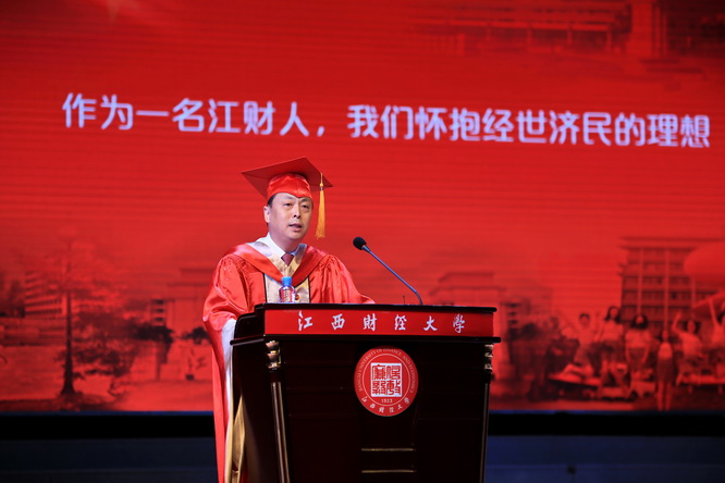 《论语》有云,智者不惑,仁者不忧,勇者不惧。唯有如此,方见大智大勇、仁者无疆的文化本色。在喧哗浮躁与淡定坚守之间,在浅尝辄止与不懈追求之间,在怯懦逃避与勇敢担当之间,在急于求成与宁静致远之间,在因循守旧与勇于创新之间,文化的力量会让你们做出正确的选择。我希望大家在走出江财之后,能够继续秉承母校教诲,以根植于内心的文化修养与无需提醒的文化自觉,成风化人,润物无声,勇敢地肩负起文化传承与创新的使命,不断向上向善向前行,就像我们校歌所唱那样,“不惑不忧不惧,不淫不移不屈,立己以立人”“信敏廉毅,敬业乐群,永葆我校光荣”。