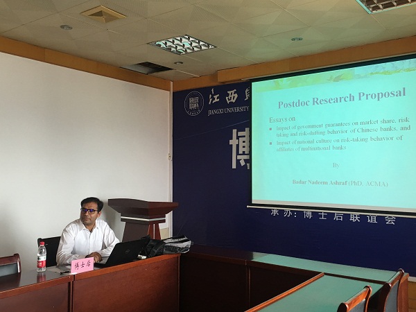 9月26日,我校首位外籍博士后开题报告会在博士后管理办公室会议室举行。报告人为Badar博士后,研究的题目为“政府担保对中国银行业市场份额、风险承担和风险转移行为的影响 ”,博士后导师胡援成教授、应用经济学博士后流动站站长严武教授(答辩委员会主席)、许统生教授、桂荷发教授、曹玉珊教授以及博管办王耀德主任等参加了本次开题报告会。