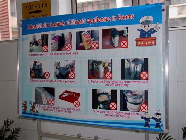 当天下午,国际合作与交流处工作人员与学生助理将在安全大检查中发现的火灾隐患所制作的海报与保卫处的消防宣传海报一同展示于公寓一楼大厅内。4时30分,随着逃生指令的发布,留学生们从各个楼层的房间通过消防逃生通道迅速跑向公寓一楼前的小广场。大家集合后,保卫处干警对大家的逃生情况进行了小结,教育同学们在遇到火警时如何选择正确的逃生方式。随后,在保卫处干警的引导下,大家一同走到消防宣传海报前,认真阅读并详细了解用电安全知识和紧急情况下的逃生知识。当留学生们最后走向暴露宿舍内现存安全隐患的海报时,大家议论纷纷,表示将对各自房间的安全隐患进行自查和处理。来自贝宁的Vignon Daniel Houndafode表示,通过此次演练活动,同学们的消防安全意识更强了。他说,为了自己,也为了公寓内的所有人,今后会更加注意寝室电器使用安全,做到人走电断,不在宿舍内使用违规的大功率电器。