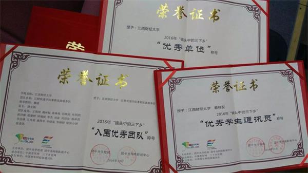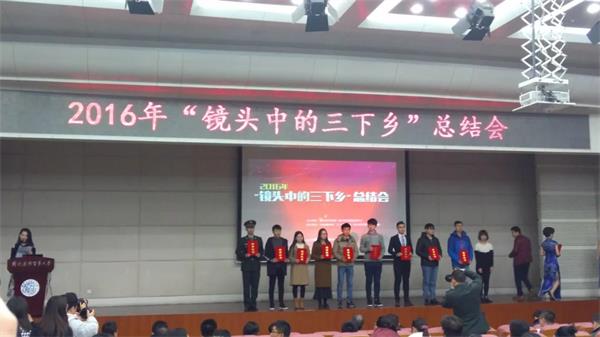 12月23日上午, 2016 年全国高校“镜头中的三下乡”总结会在对外经济贸易大学隆重举办。在本次三下乡中,我校获得多项殊荣并被授予“优秀组织奖”,其中,江财软通学院暑期实践服务队与江财旅城保险扶贫实践团荣获“入围优秀团队奖”,旅城学院张志军老师获得“优秀指导老师奖”,旅游与城市管理学院戴凡媛和软件与通信工程学院赖林权被评为“优秀学生通讯员”,两人也一同代表学校参与本次“镜头中的三下乡”总结大会并上台领奖。
