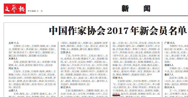 中国作家网日前发布中国作家协会2017年第6号公报,公布了2017年中国作家协会新会员名单,其中人文学院教师周博文在列,成为我校第一位加入中国作家协会的教师。《文艺报》当日第二版也发布了新入会的中国作协会员名单。