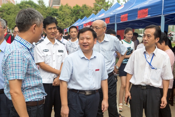 9月9日,是江财2017级新生正式报到入学第一天,天气有点闷热,麦庐园校区迎新点上,工作人员正在“流着汗水默默辛苦的工作”——紧张有序地迎接来自五湖四海的学子们。当天上午8时30分,在校属有关部门负责同志陪同下,卢福财校长亲临麦庐园迎新点现场巡视,查看各学院迎新工作,汗水也湿透了他的衣背。