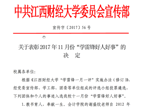 27年来,江西财经大学坚持每月都开展学雷锋活动,每月初,各班团支部和学生党支部负责把收集到的好人好事上报推荐给各学院所在分团委,校团委指定专人审核后由宣传部以网上公示和师生投票支持的方式广泛征求意见。27年里,全校涌现学雷锋事件近2500件,各基层单位评选出逾百万件先进事迹:大学生们6年如一日照顾南昌市裘家厂的独居老人饶裕国、11年如一日护理瘫痪在床的温志坚老师……