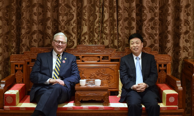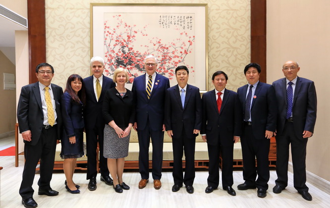 4月16日,百花齐放,春意盎然, 时值我校与纽约理工学院MBA项目合作办学的第二十年。美国纽约理工学院新任校长汉克·弗利博士、校长夫人卡琳·弗利博士、教务长及学术副校长卢·赖尼施博士、管理学院副院长刘贤方教授等一行八人应邀来访我校。 校党委书记王乔与汉克校长一行进行了亲切交谈, 共话两校合作办学的美好明天。