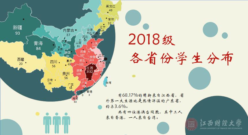 据大数据分析,在68.17%的2018级新生是江西本地人,而剩下的31.83%均来自省外。其中,省外的第一大生源地是广东省,新生人数约占3.6%。值得一提的是,今年有四名来自港澳台的同学,其中三人来自香港,一人来自台湾。除了生源地多元化这一特点之外,新生的民族也是多种多样的。在新生的民族中,共有26个少数民族。其中土家族的新生最多,维吾尔族和回族紧跟其后。虽然高山族、门巴族、傈傈族、赫哲族和哈尼族这些民族比较罕见,但是今年这些民族均分别有一名同学加入了江财这个大家庭。不同民族的同学共聚一堂,极大地促进了我校的文化交融与文化碰撞。