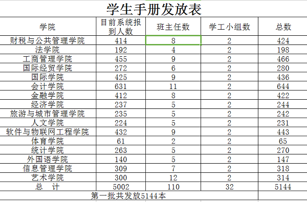 每一年新生开学都会发放学生手册,今年的学生手册共发放5002本,也就是说今年目前系统报到人数总计5002人,会计学院目前系统报到的人数为631人。而全校的18级班主任数总计110人,其中,艺术学院的班主任数最多,高达12个,比新生人数最多的会计学院还要多一名。根据数据显示,每个学院都有两个学工小组,总数为32个。
