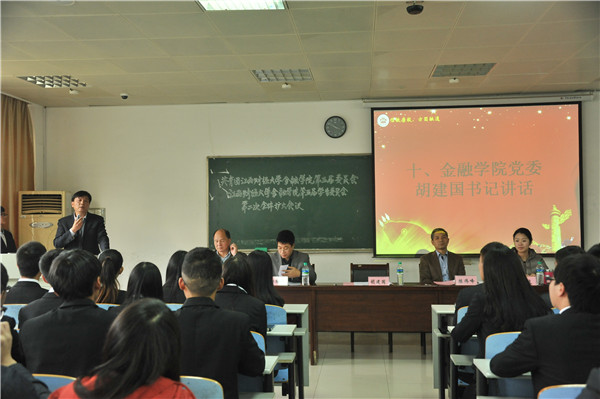 2014年11月21日下午3时,共青团江西财经大学金融学院第五届代表大会、江西财经大学金融学院第五届学生代表大会第二次全体(扩大)会议在第五教学楼隆重召开。莅临本次大会的嘉宾有金融学院党委书记胡建国,党委副书记陈伟峰,党委干事邱晓平,正科级辅导员周洪,以及分团委书记张毅。金融学院116名学生代表参与本次大会,会场气氛庄严,秩序良好。