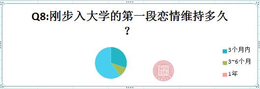 6. 步入大学的第一段恋情维持多久:1年以上占60%,三个月内占30%,3~6个月占10%。