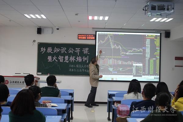 第三届“大智慧杯”金融挑战赛报名正在火热进行中,与此同时出现的问题是——大多数对炒股有兴趣的同学并没有掌握与炒股相关的知识,此次来自不同年级,不同专业的50多名同学慕名前来聆听公开课,认真学习相关炒股知识。