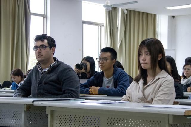 本届“新生杯”英语演讲比赛共分为海选、初赛以及决赛。10月21日下午决赛现场,参赛选手需首先进行5分钟的英文阐述,再针对外教评委的现场提问进行自由发挥。