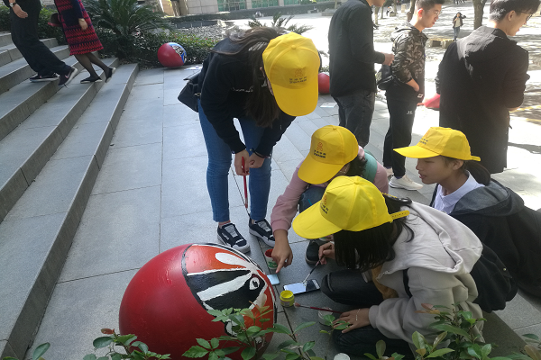 活动期间,志愿者们按照分工和计划,有条不紊、耐心细致地擦洗雕塑上和基座上的尘土,并利用自己的艺术专业特长给基座画上各种可爱的卡通形象、传统脸谱等,旨在通过艺术的形式,为校园带来了一抹亮丽的色彩,并致敬江财,献礼95年校庆。这些涂鸦创作力争体现艺术性和校本性。从校园南北区间走过,即使没有指引也可以寻找,斑斓五色冲击着行人的余光,生动有趣的卡通人物,或是栩栩如生的写实画作,一改以往这条路的单调与乏味,在历史感与陈旧感中,又增添了新鲜的生机活力。