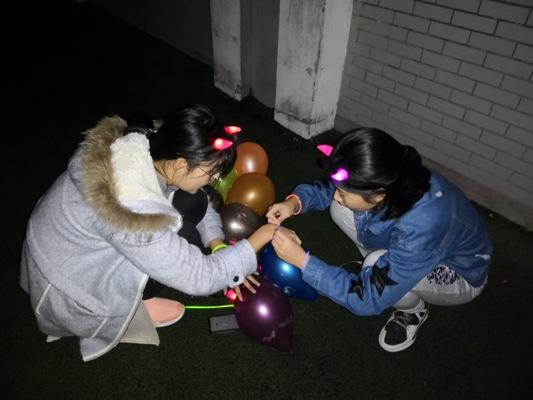 活动开始前,青协志愿者们提前三十分钟开始了紧张的准备活动。志愿者鼓足干劲吹气球,把荧光手环分发给同学们,并给同学们画上各种各样的荧光小彩绘。伴随着欢快而动感的音乐声,活动正式开始,同学们拿着气球,活力十足地开始了荧光夜跑。活动期间欢声笑语不断,偶尔还能听到气球被踩破的爆裂声,这象征着青春的勇敢和坦率。同学们走出宿舍、走向操场、从线上到线下,在夜跑中挥洒汗水、大胆交友。一抹抹跃动的荧光仿佛象征着学子们青春的激情,在暗夜里渲染出别样的风采。
