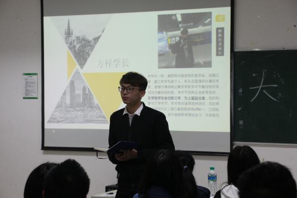 随后,孙韵汶学姐向大家讲述自己的留学经历,并向大家详细介绍我校出国留学项目及几所国外院校。通过她的介绍,同学们对出国留学有了更深了解,出国也成为不少同学未来的方向之一。最后,方祥学长对如何平衡学习和学校活动的问题进行了详细解答。众所周知,大一学生学校活动较多,繁忙的课余活动占据学习时间引起同学们的抱怨消极心理是常见现象,对此,方祥学长解释道,大学是一个培养综合性高素质人才的地方,充分利用活动时间培养自己的各项技能十分重要的。工作和学习并不对立,关键在于同学们能否合理利用时间。他说,即使在睡觉前,我们仍可以拿出一段时间学习。工作只是减少娱乐时间,学习时间是可以挤出来的,我们理应保持积极向上的心态,让每一天变得充实而有意义。
