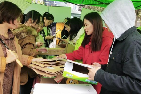 虽天公不作美,活动期间一直淅淅沥沥地下着雨,但这并不能浇灭同学们参与活动的热情,不断有同学前来参与活动。他们认真地听着工作人员讲解环保知识,提出自己的困惑。工作人员耐心解答,现场气氛活跃。最后,他们把快递纸箱留下来交给工作人员整理,心满意足地抱着礼品离开。收集的完好快递纸箱将由工作人员整理并交由驿站循环利用,其他纸箱则进行“纸塑料分离”后进行回收。还有些同学带来了参与纸箱改造比赛的作品,“我认为这个活动挺有意思的,”其中一个同学笑着说,“也许我的作品不是最出色的,但是我算也是为环保出了一份自己的力量,以后我还会参与类似的活动。”