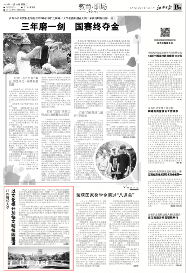 《江西日报》11月20日B3版以《江西财经大学以文化提升加快文明校园建设》为题,对我校文明校园创建工作作了报道。全文如下: