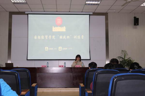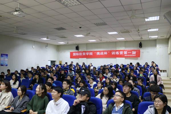 11月23日下午,由国际经贸学院实践部举办的挑战杯训练营第一讲在蛟桥校区大学生活动中心102室顺利举办。此次训练营由国贸学院分团委周妍老师主持,并邀请到“创青春”比赛国家金奖、银奖项目指导老师谢亮老师与况宇翔老师,给国贸学子带来参与“挑战杯”比赛的经验分享。