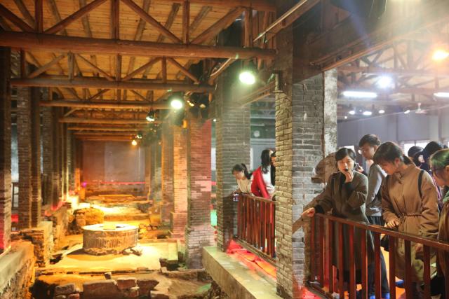 在讲解员的指引下,学生们来到了有近千年历史的元代酒窖遗址,观摩美酒酿造的全过程:李渡酒历经出甑、入池发酵、开窖出池、投粮拌料等十多道工序而制成,酿酒师们严格遵守每道工序的质量标准。据了解,这个古窖遗址已有800多年历史,是时代最早、遗物最多、遗迹最全、延续时间最长、最富有鲜明地方特色的工艺烧酒作坊遗址。李渡烧酒作坊的发现,为中国元代已生产蒸馏酒的论断提供了最具说服力的实物依据。