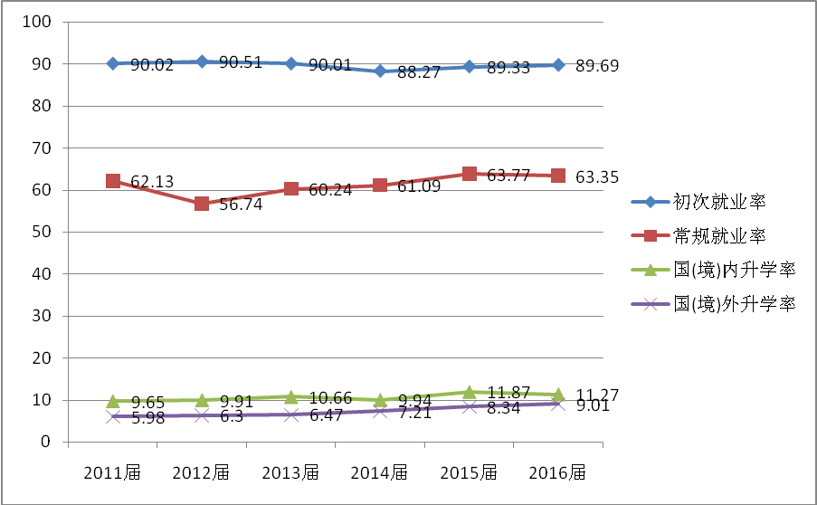 应届毕业生就业基本情况 | 总数 | 4379 | 89.69% | 初次就业率 |