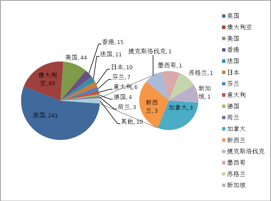 440名出国或出境继续深造的毕业生中,其中241人去往英国高校,比率为54.77%(2015届为57%);其次为澳大利亚(89人)和美国(44人),比率分别占20.23%和10%(2015届分别为19%和10%)。