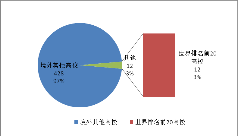 国(境)外升学毕业生中,有12人申请到排名全球前20的高校(排名以最新版QS全球大学排名、THE全球大学排名和上海交大全球大学排名前20中至少出现1次计),占出国出境毕业生的2.73%(2015届为23人,占比5.58%)。
