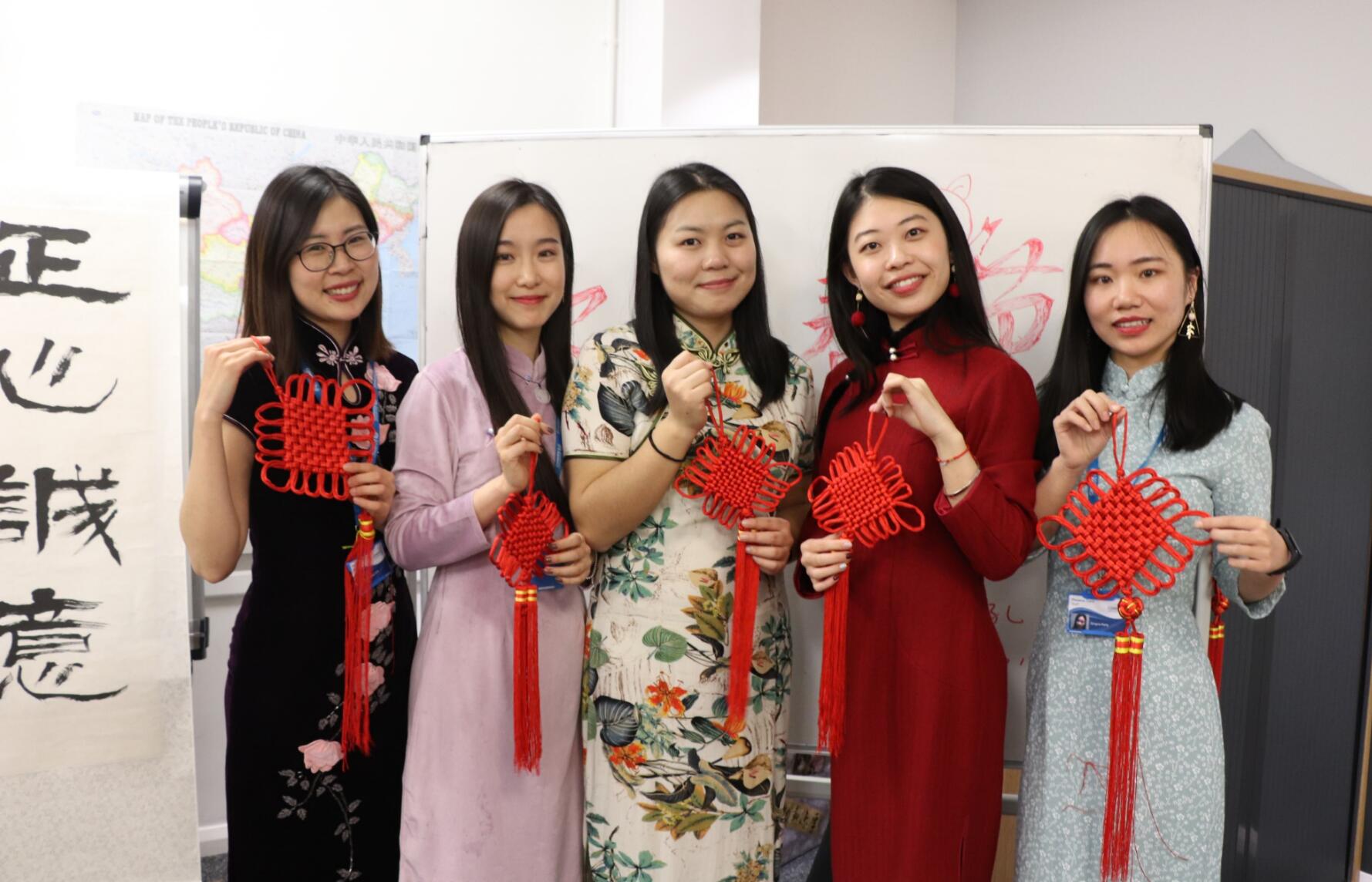 在孔院老师的悉心装扮下,整个孔院焕然一新,充满了吉祥喜庆的氛围。门前贴上了春联,墙上挂上了中国结,桌上摆满了各种中国传统零食,孔院的老师们也换上了中国传统服饰——旗袍。