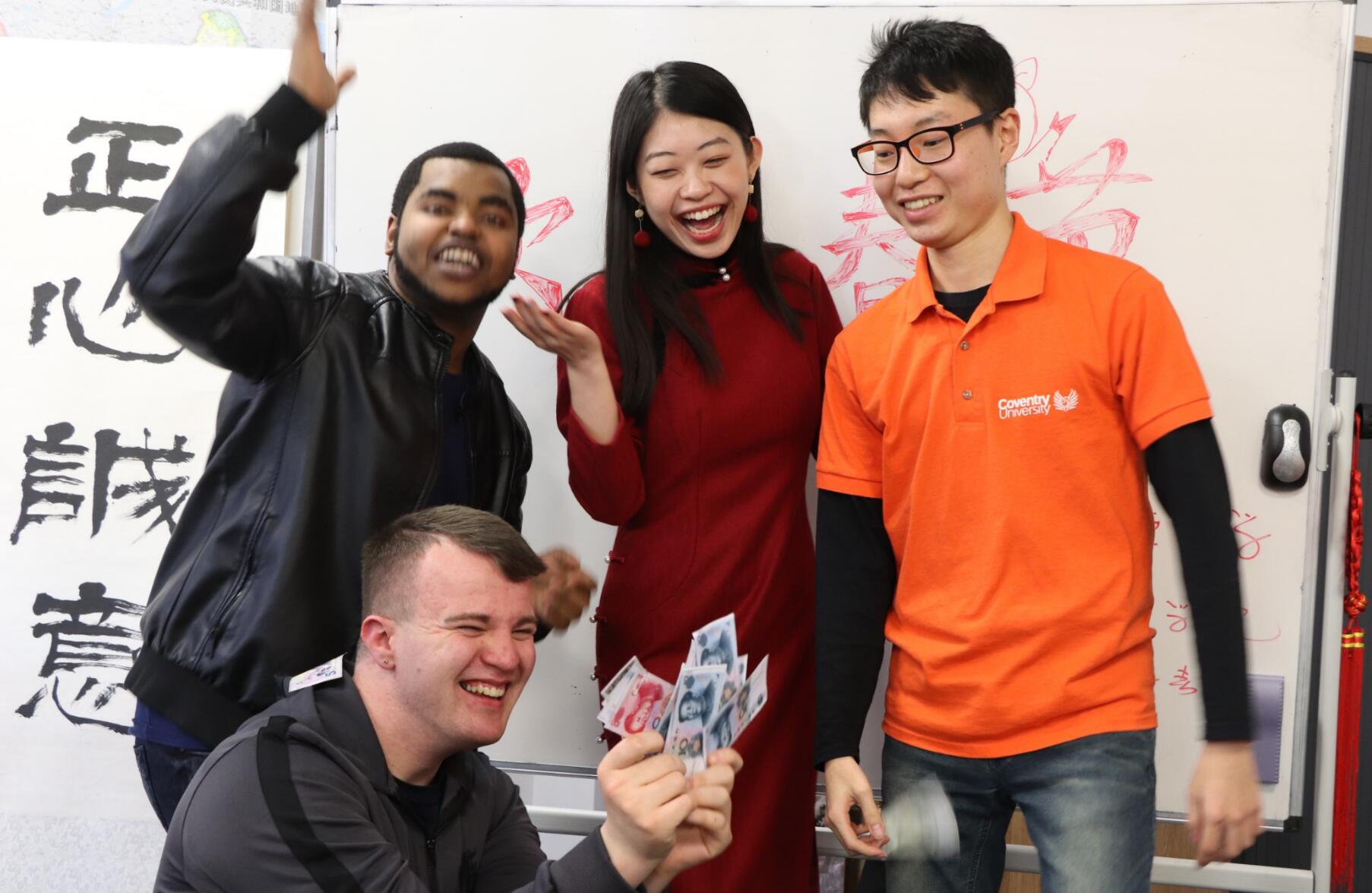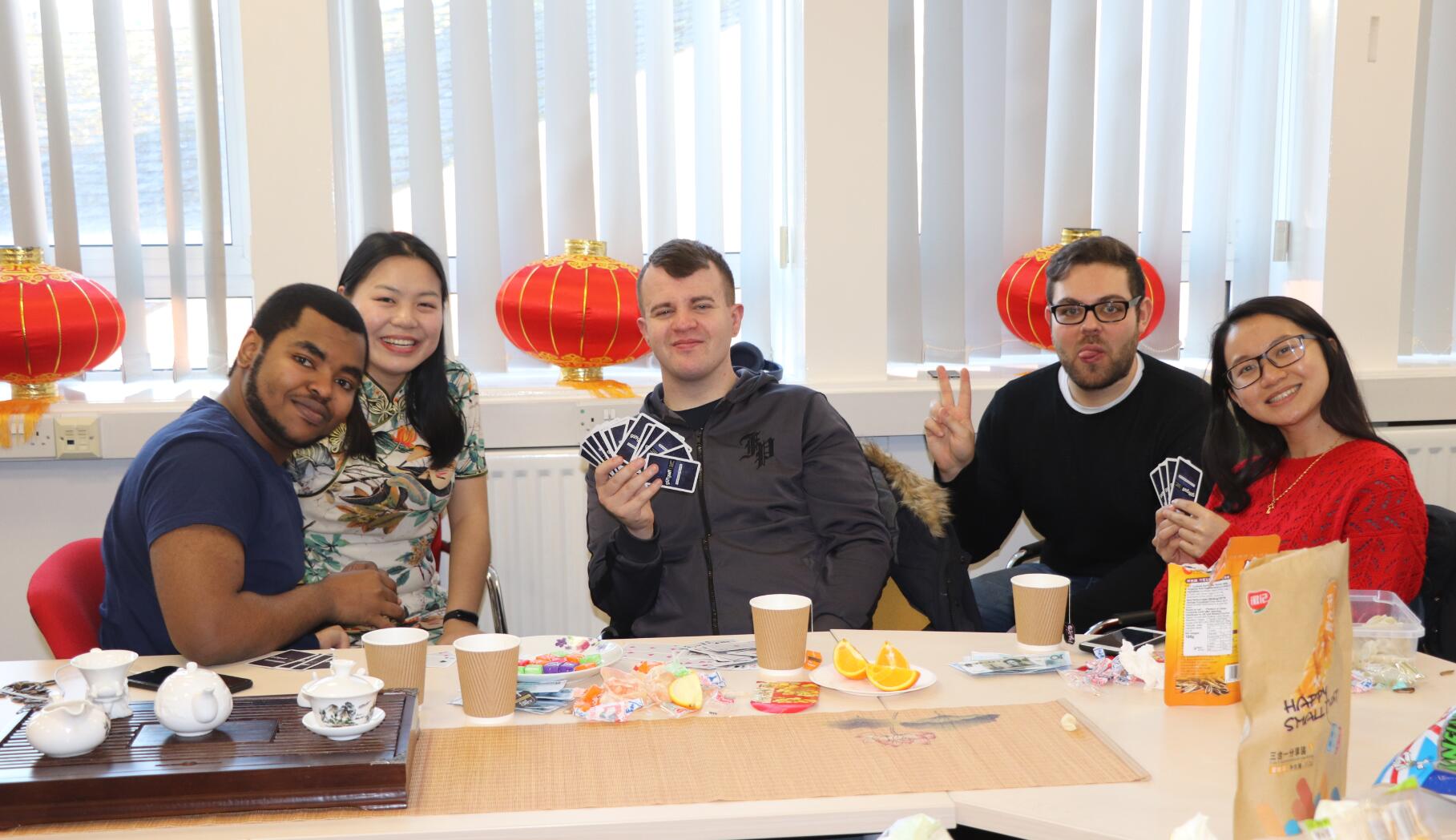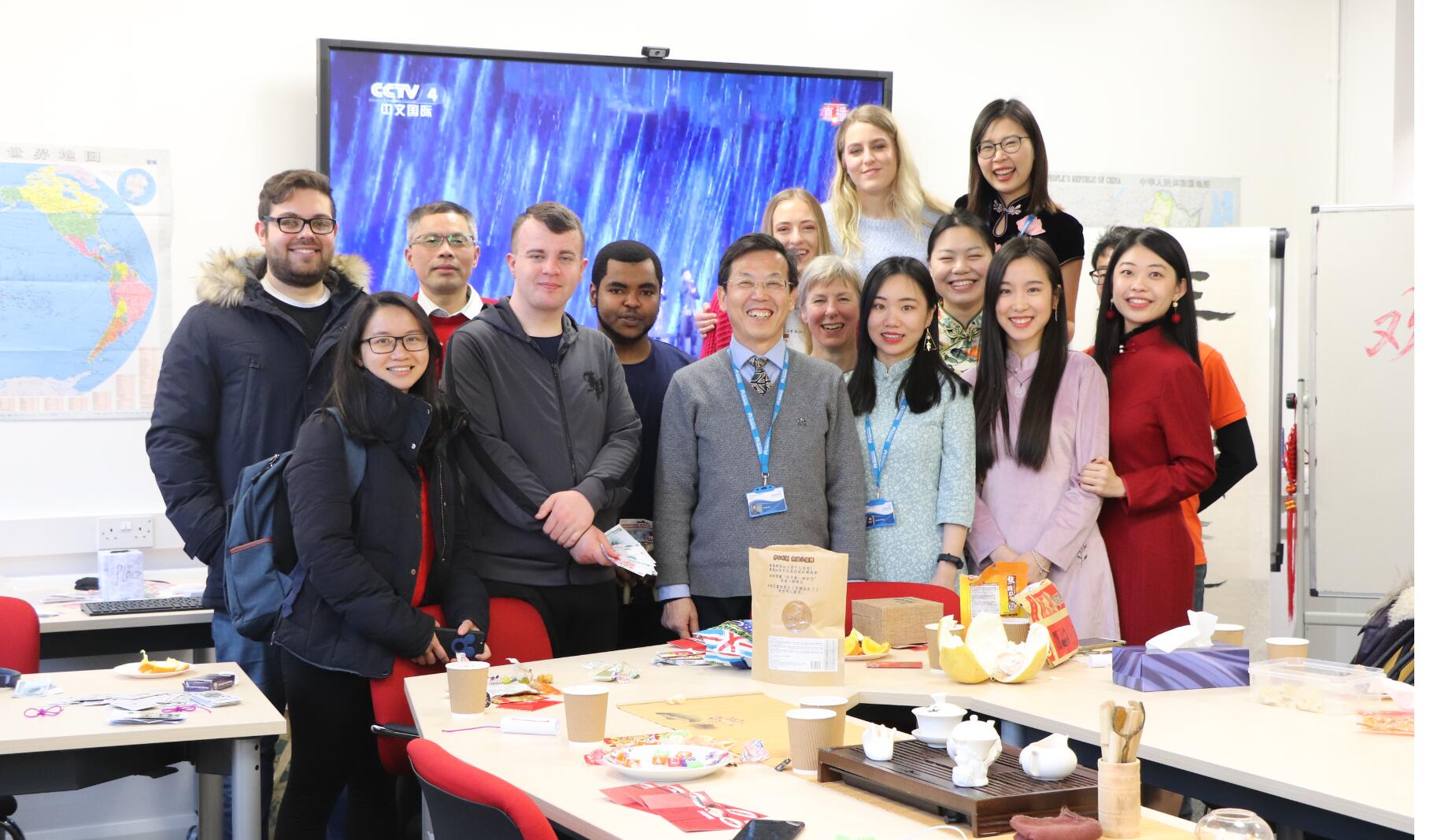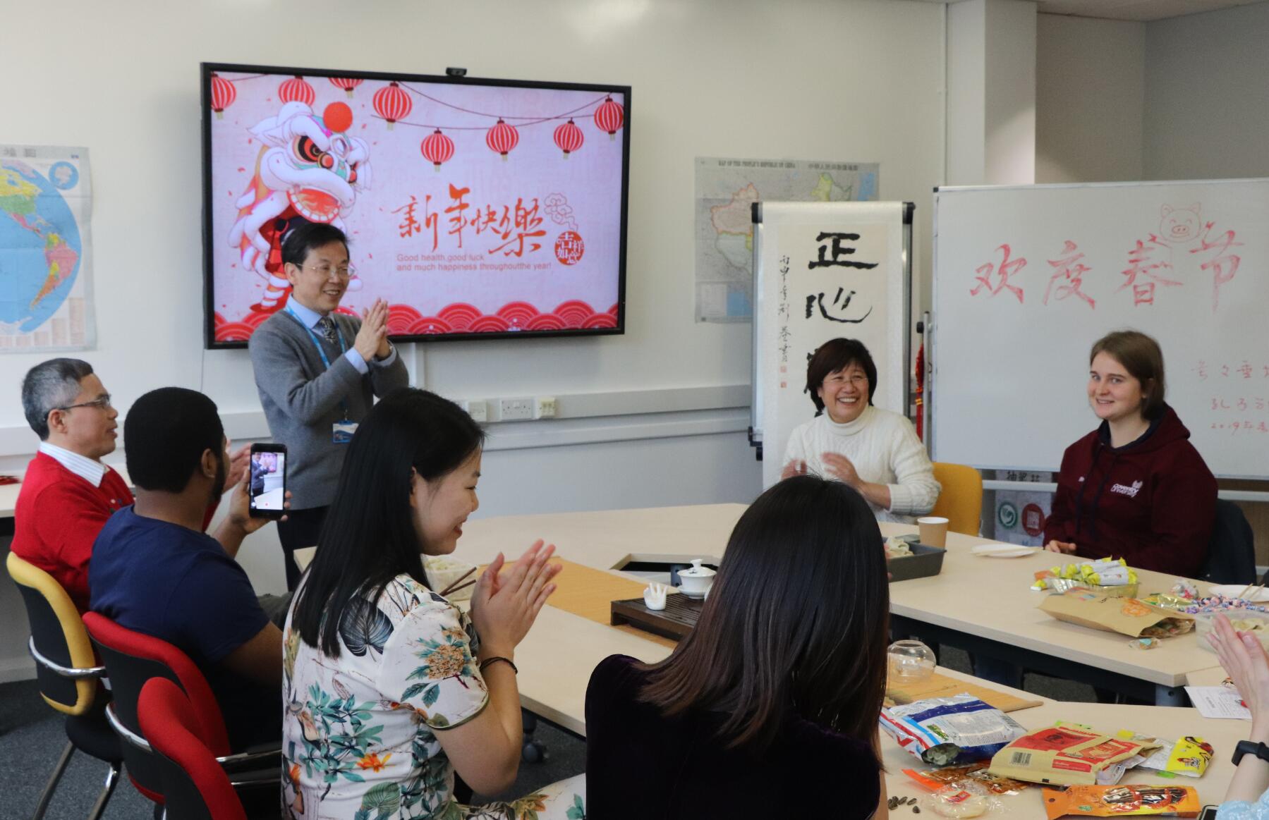 旺狗报喜辞旧岁,金猪纳福迎新来!2018年落下最后一个音符,2019年奏响华美的乐章。伦敦时间2月4日中午,正是中国大年三十晚上——除夕。在这个辞旧迎新、普天同庆的日子里,考文垂大学孔子学院举办了除夕迎新聚会,近二十名外国学生参与了活动。大家一起吃饺子,玩游戏,看春晚直播,其乐融融。