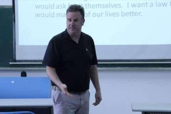 本次英语角的主题是:“Alaw you want tosee.”他引导同学们从生活中对某种法律需要的原因以及该法实施对于社会生活的益处出发,思考自己希望看到的法律。他以自己邻居的好友总在清晨到访并鸣笛示意的做法感到苦恼为例,阐述了鸣笛是一种严重的声音污染,对于周围居民有不好的影响,表示希望有一部禁止鸣笛的法律。外教在讲解过程中声情并茂,模仿汽车的鸣笛声,引得同学们捧腹大笑,缓解了课堂中的紧张气氛,拉近了与同学们之间的距离。