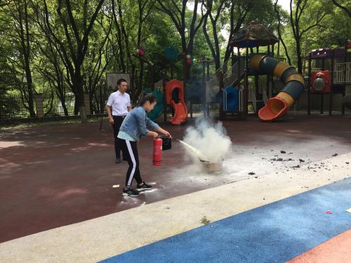 上午9:40左右,园内忽然听到紧急的警报声,各班教师迅速按紧急预案的疏散线路带领幼儿拿起湿毛巾,捂住口鼻,猫着身子,分两道楼梯迅速且有序下楼来到操场。很快孩子们集中到操场安全地带。演习结束后,赣安公益培训中心的万警官为孩子、老师们演示用灭火器灭火的过程,也邀请了孩子、老师们进行体验。