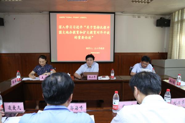会议伊始,王小平以“深入学习习近平关于坚持扎根中国大地办教育和扩大教育对外开放的重要论述”为题,结合学校工作实际,谈到扎根中国办教育是为了彰显对中国特色社会主义教育发展道路的自信,以及展示中国教育发展过程中一系列教育理念的强大生命力和魅力;扎根中国办教育就是要瞄准“中国特色、世界水平”的现代化教育目标,攻坚“深水区”、啃下“硬骨头”,追赶并引领世界一流,办好人民满意的教育;扎根中国办教育,必须要坚持正确的政治方向,必须要坚持中国特色,必须要解答好中国教育发展不平衡的现实难题;王小平副校长还提及扩大教育对外开放旨在构建人类命运共同体视野下,树立新时代教育对外开放观,新时代国际教育交流合作肩负着文化交流以及思想交流的重任。