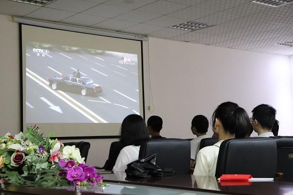 2019年10月1日,中华人民共和国成立70周年,举国同庆。软件学院组织在校师生在荟庐一楼报告厅、二楼会议室通过网络观看了国庆70周年大阅兵直播。当习近平总书记等党和国家领导人出现在天安门城楼时,大家全体起立热烈鼓掌。院党委书记姜红仁、党委副书记彭敏及百余名师生共同观看。