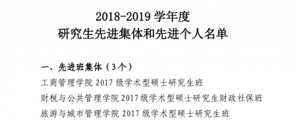 日前,研究生院举行2018―2019学年度研究生先进集体评选活动,经过激烈的角逐,凭借着优良的精神风貌和突出的表现,工商管理学院2017级学硕研究生班荣获校“先进班集体”称号,在全校范围内只有三个班级获此荣誉。