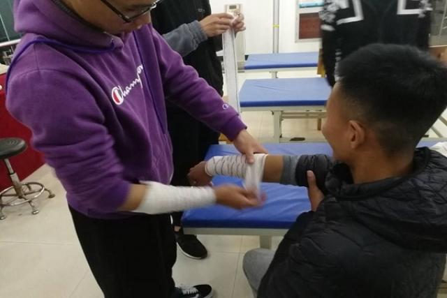 创伤包扎是应对意外运动损伤最常用的救护方法,曾志同学通过手把手示范、一对一教学的方式带领新成员学习创伤包扎技能。新成员仔细听讲并提出问题,积极学习救护新技能。在之后的创伤包扎练习中他们认真对待,不断练习,将包扎要点牢记于心。