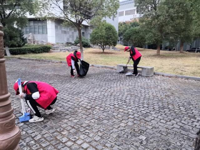 校园里充满了落叶被扫动的簌簌的声音,同学们弯腰的身影也随处可见。尽管天公不作美,寒风刺骨,同学们依旧尽职尽责地认真工作。青协委员在一旁指点同学清扫,并且记录着这温馨的时刻。大家各司其职,没过多久,校园地面就焕然一新。不管是林荫小道间的落叶,还是草坪深处的烟头纸屑,都不见了踪影。夕阳下,同学们劳动后的手,早已冻得通红,但他们脸上挂着的却是满意的笑容。