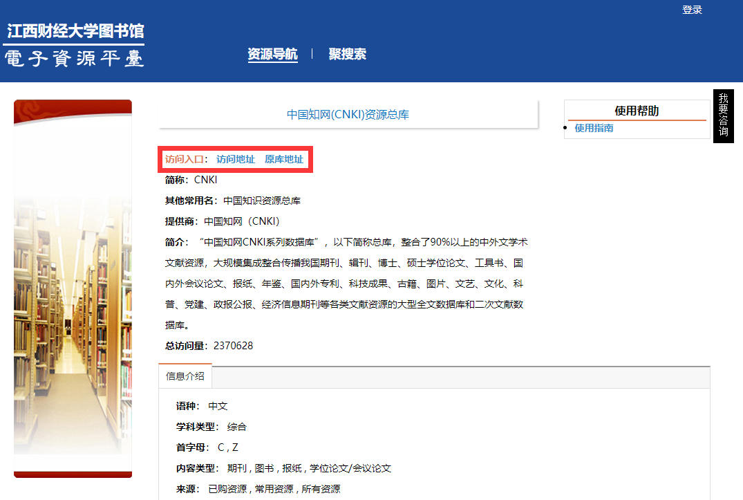 (3)如果通过图书馆电子资源“访问地址”访问电子资源出错时,请换用电子资源链接二“原库地址”试试。