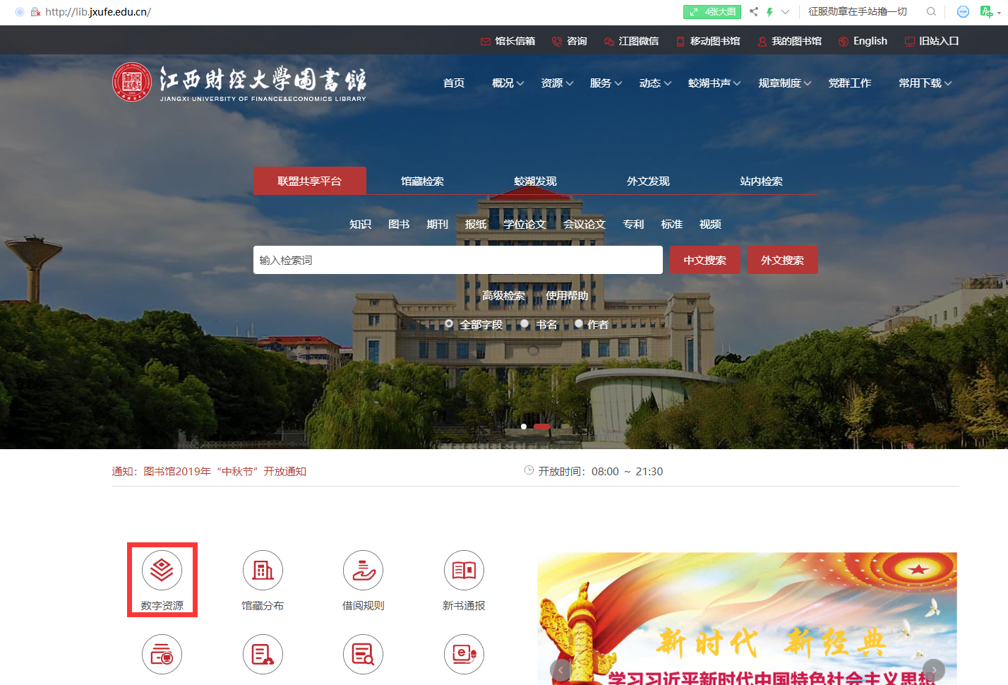 1、在浏览器地址栏输入http://lib.jxufe.edu.cn或http://lib.jxufe.cn进入图书馆主页。