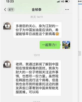 已经回到自己国家的孟加拉的在读本科生胡山和韩国的在读本科生金桢泰在得知国内急需口罩应急物资时,他们在第一时间纷纷表示要向我校寄送口罩等,第一批3000个口罩已于2月6号寄出。他们把中国当做第二故乡,把江财当作自己的家。