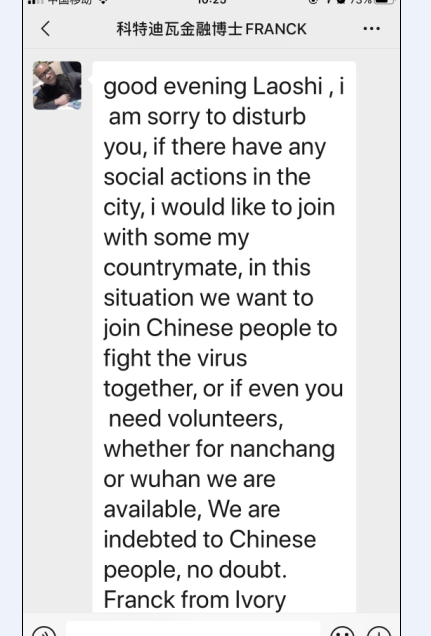来自科特迪瓦在读金融学博士生FRANCK EDOUARD GNAHE在知道疫情防控的艰难时,深夜主动请战,要求加入疫情防控的工作中去“老师,这么晚打扰你,如果有什么需要做的,即使是做志愿者,无论是在南昌还是在武汉,我想和我的同胞一起加入中国人民这场战斗中来,毫无疑问我们很感激中国人民。””