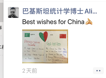 来自巴勒斯坦的统计学在读博Ali Yousaf经常在其微信朋友圈发祝福中国、中巴友谊、中国加油等消息来支持抗疫,“非常感谢你们,我将把在疫情期间的你们所采取的防控措施及对我们的关心和照顾写成文章,让全世界知道。”
