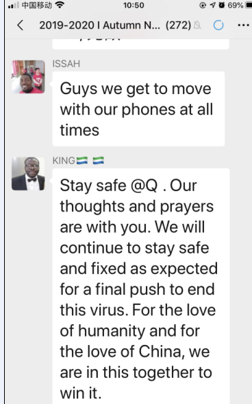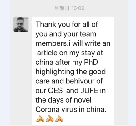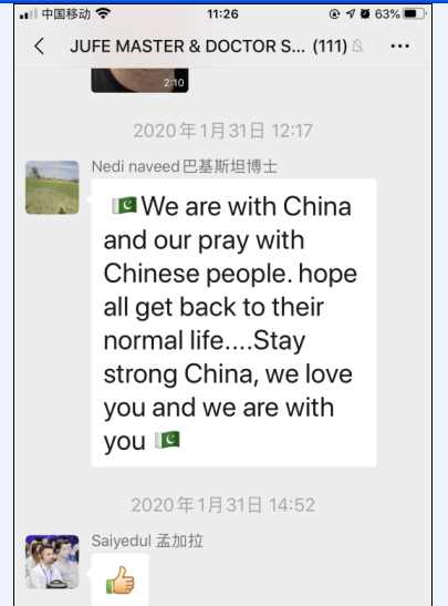 在我校来华留学大家庭的微信群里,来自巴基斯坦、孟加拉、赤道几内亚等70多个国家的留学生们纷纷在群里自发地发表“我们热爱JUFE这个大家庭,我们热爱中国,我们一起打赢这场战斗”“中国加油!”“武汉加油!”等信息,传递正能量!